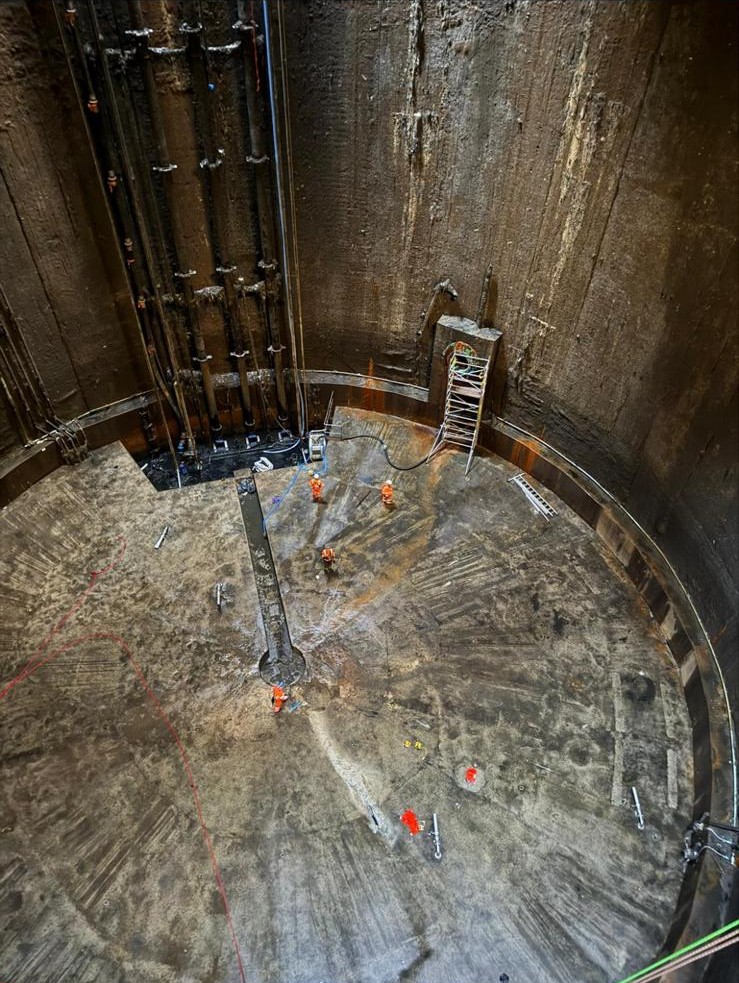 Because the tanks are 40m deep and 36m wide, cranes are used to lower all the equipment and people in and out. Mini diggers are used to scoop the sandy material into skips, and these are lifted out when they’re full.