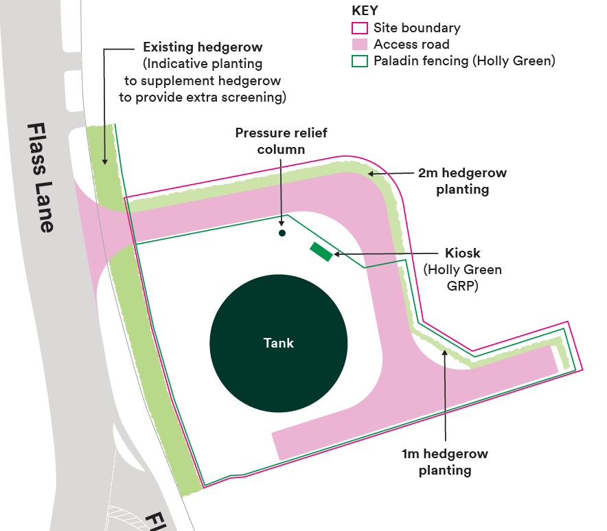 We’re proposing to build a new 27 metre diameter storage tank which can hold around 5,500m3 – that’s more than two Olympic sized swimming pools! This will provide storage for 9 storm overflows in one location and reduce disruption across Barrow. Upon completion, the site will be landscaped back to grass with a fenced compound containing a kiosk (building). The fence will mostly be screened by the existing hedgerow apart from the new access gate off Flass Lane.