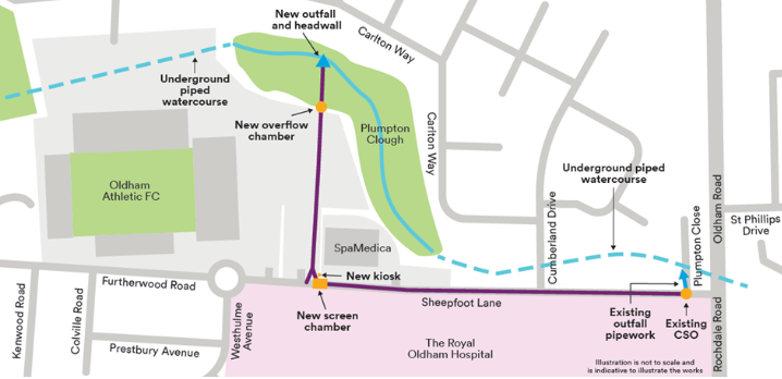 We will be installing new pipework under the road along Sheepfoot Lane and through Oldham Athletic Football Club land. We would need to connect into Plumpton Clough via a new outfall behind Carlton Way, removing the existing outfall which currently joins the brook in a culverted section near Plumpton Close.